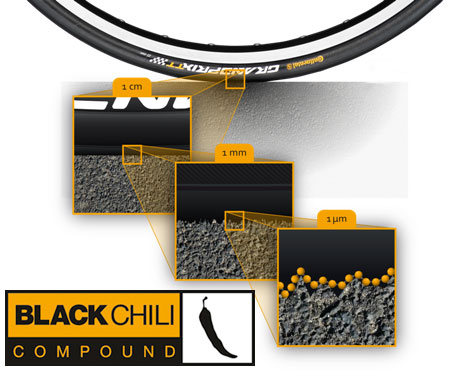 Continental's Black Chili rubber compound improves every ride through the use of microscopic carbon nanoparticles to increase traction, decrease rolling resistance, and extend the life of your tires.
